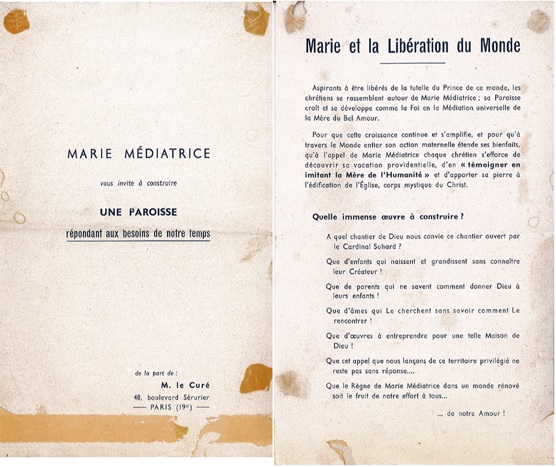 Marie-Médiatrice, à laquelle on ajoutera plus tard le nom de N.-D. de Fatima, est une église votive. C’est un Sanctuaire construit pour remercier la Sainte-Vierge d’avoir protégé Paris en 1944.