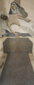 Sous la pieta de la petite chapelle se trouve une tombe, celle de monseigneur Touzé. Mort en 1960, il a été jusqu’en 1957 directeur des chantiers du cardinal. Marie-Médiatrice a été sa dernière construction et, à son avis la plus importante. II a demandé, et obtenu, d’y être enterré. Lorsque Marie-Médiatrice a été ouverte, c’était la 130e réalisation des chantiers du cardinal.